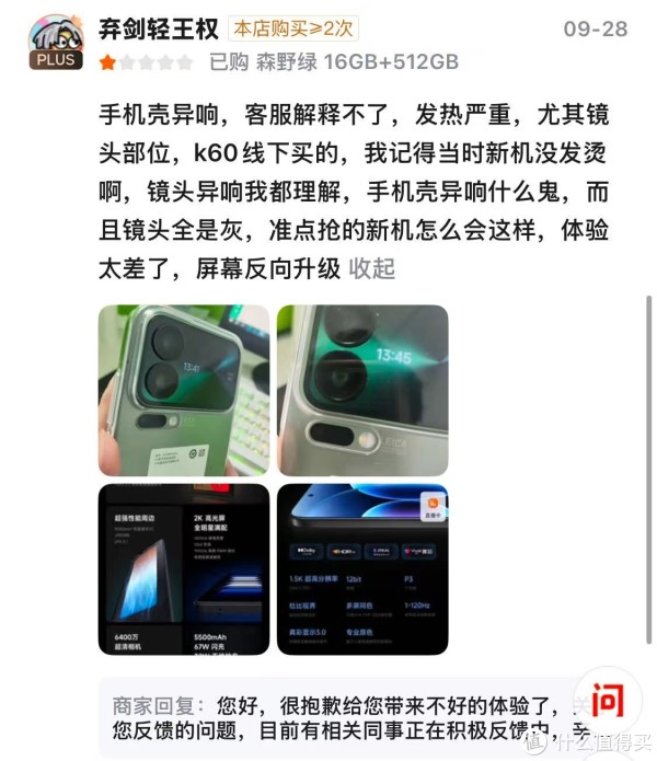 还有效户买了红米K60,敬佩小米又脱手小米17Pro,不外评敷陈手机壳异响,还有镜头异响,镜头异响可能是因为潜望长焦,手机壳异响也不知谈什么情理,我个东谈主以为莫得太大问题,要道是发烧严重,镜头全是灰,如实有点离谱。