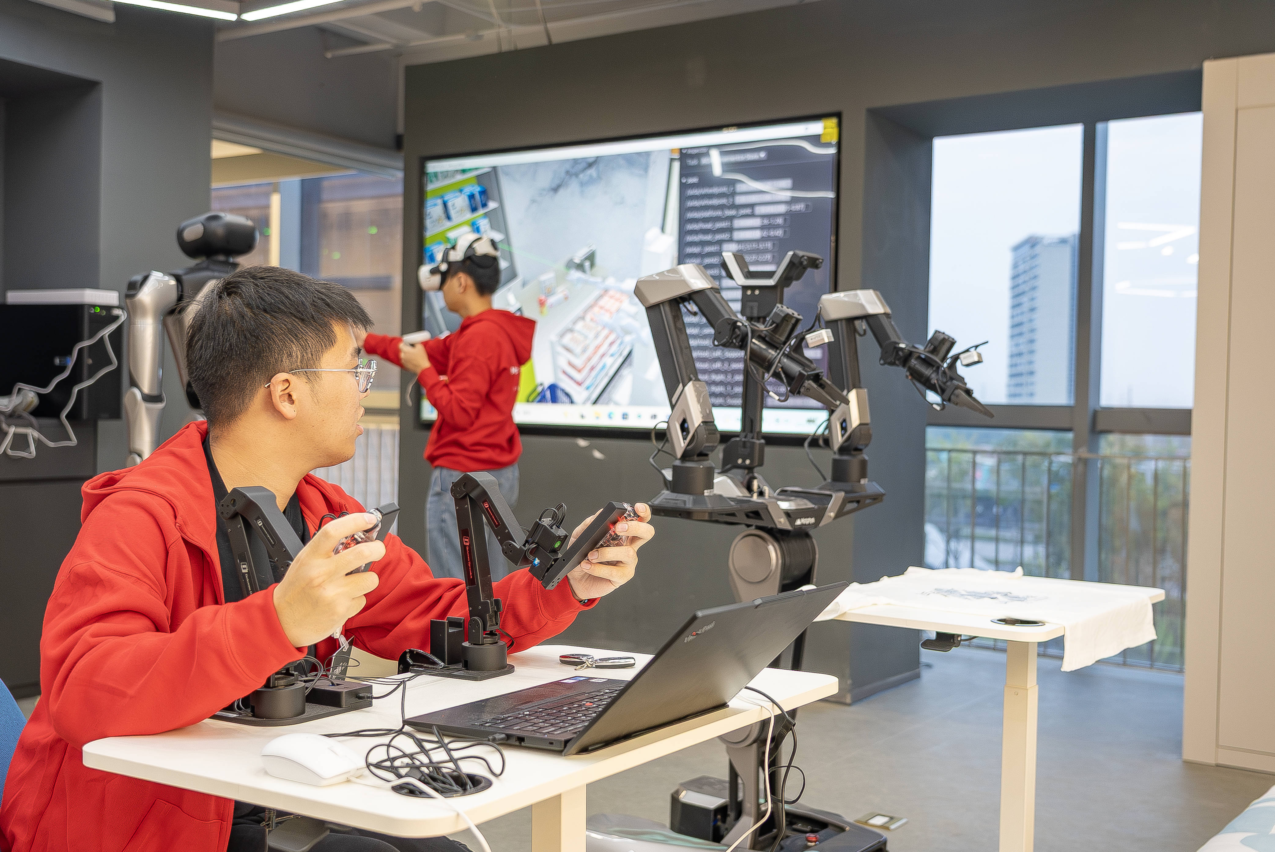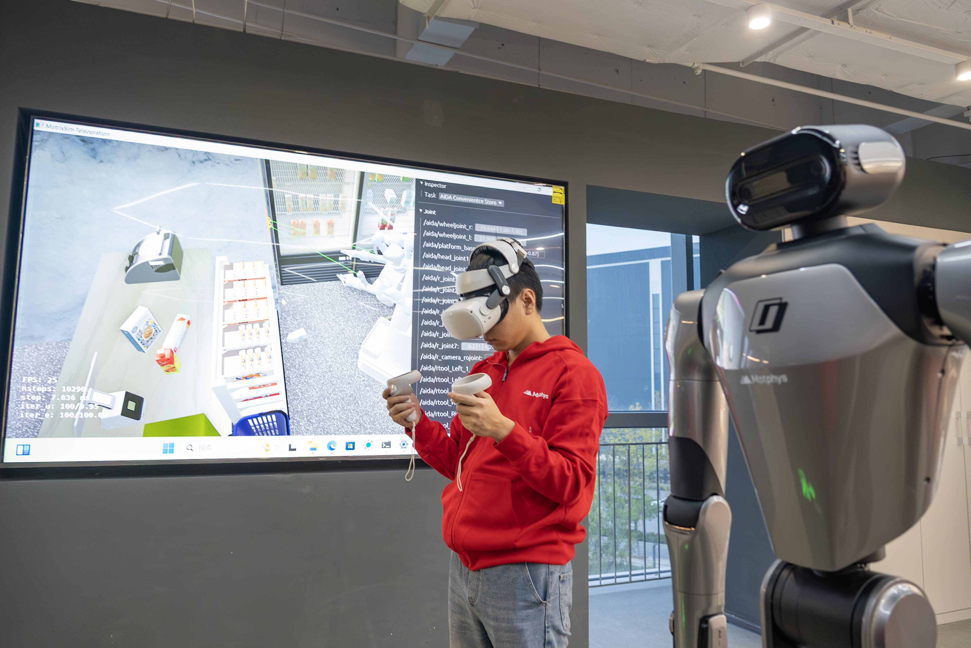 在编造超市中提起一瓶饮料,践诺中的机器东说念主便同步取出一瓶饮料;在编造卧室叠好被子,机器东说念主也能精确将被子折叠整皆……在磨练场现场,记者通过VR开拓躬行体验了一把仿真磨练的经由。