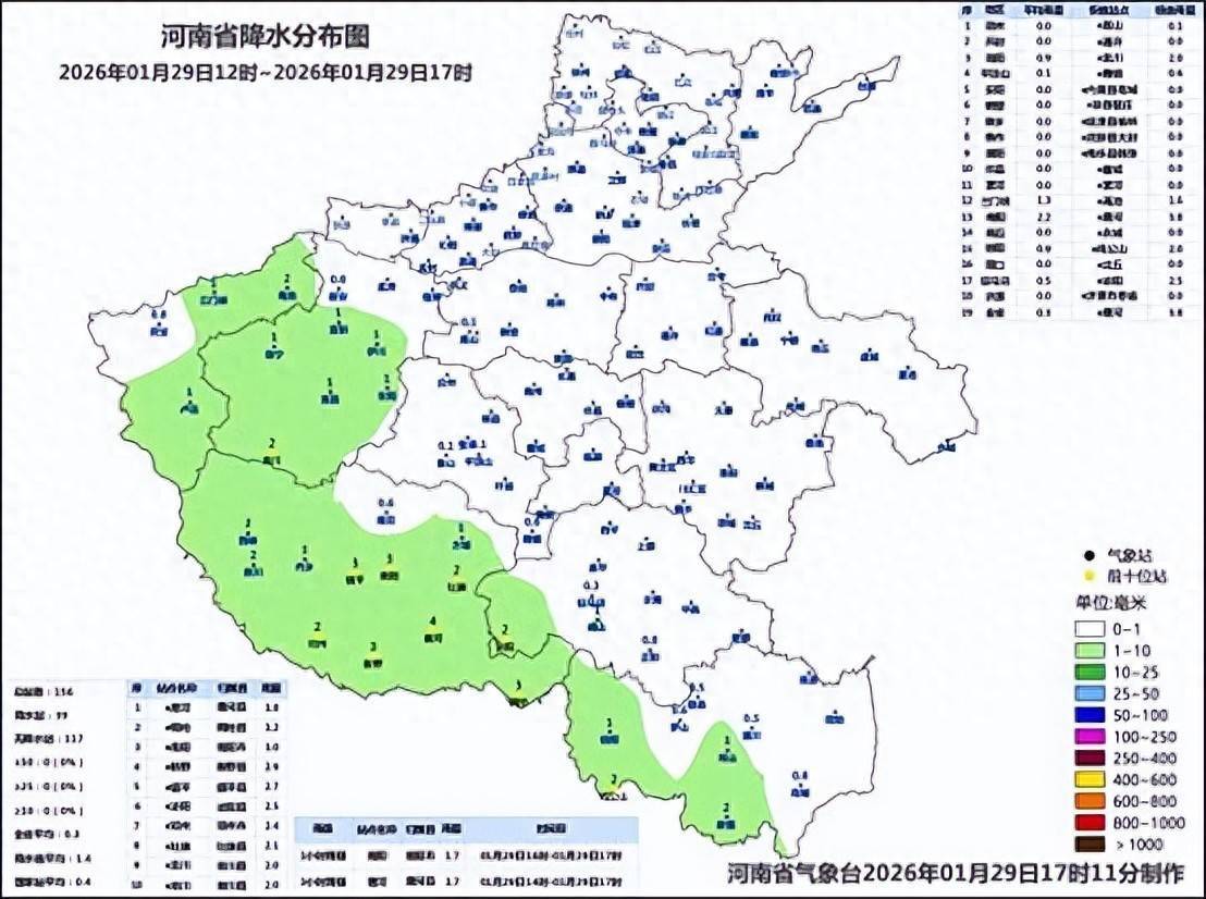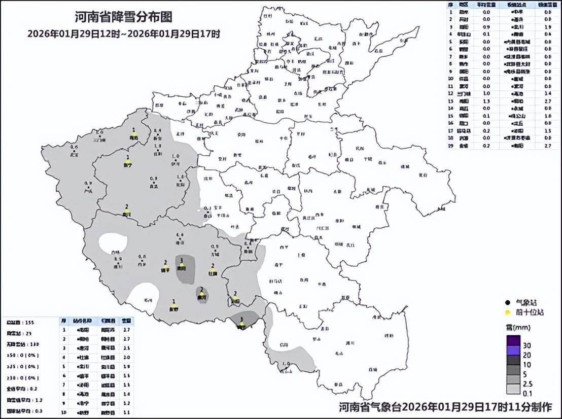 省征象台监测清楚,1月29日12时至17时,我省西部出现小雪,南部雨夹雪转小到中雪,最大降水量出当今唐河3.8毫米,最大降雪量出当今南阳2.7毫米。