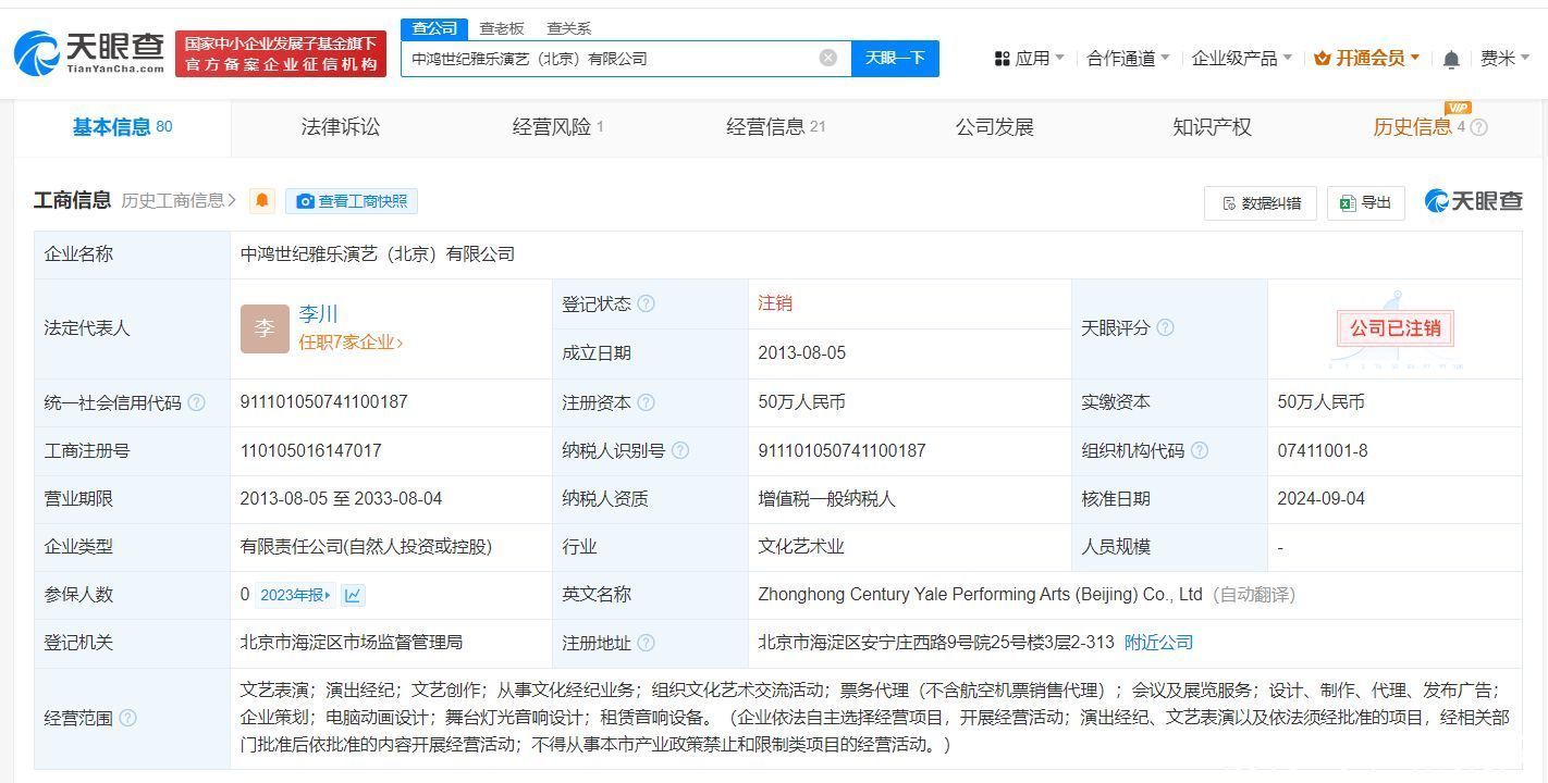 天眼查App浮现,近日,中鸿世纪雅乐演艺(北京)有限公司观念景象由存续变更为刊出。本年7月火星电竞CHINA,该公司已发布刊出备案公告,刊出原因为方案终结。