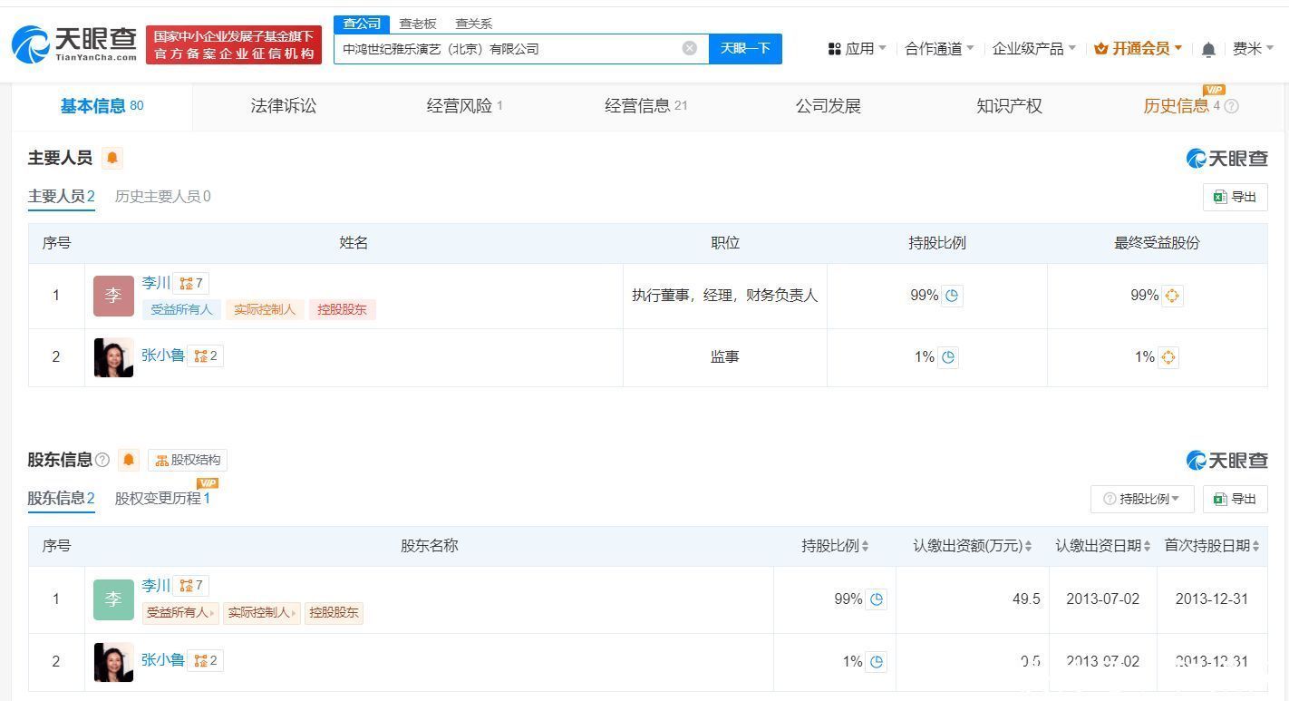 该公司拓荒于2013年8月,法定代表东说念主、推论董事、司理、财务肃肃东说念主为李云迪父亲李川,监事为李云迪母亲张小鲁,注册成本50万东说念主民币,观念畛域含文艺扮演、献技经纪、文艺创作、从事文化经纪业务、组织文化艺术疏通步履、票务代理等。推动信息浮现,该公司由李川、张小鲁区分抓股99%、1%。